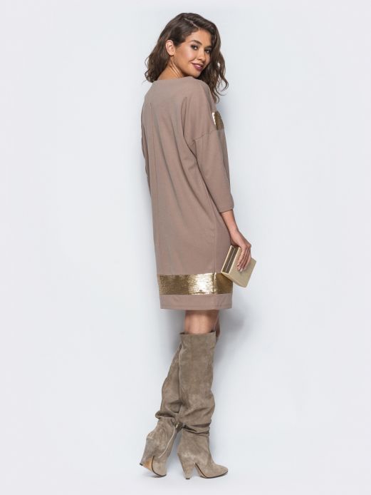 Лаконічна сукня прямого крою з вставками з мерехтливих паєток. Виріб зі спущеною лінією плеча - додає об'єм в області грудей. Рукав довжиною 3/4 чудово підкреслює витонченість фігури і красу жіночих рук. Мерехтливі вставки і простота крою прекрасно підійдуть для всіх модниць. Без застібок. Легко комбінується з будь-якими аксесуарами, роблячи ваш образ максимально різним. Розбавте стильною моделлю Ваш образ в магазині Mamacity!