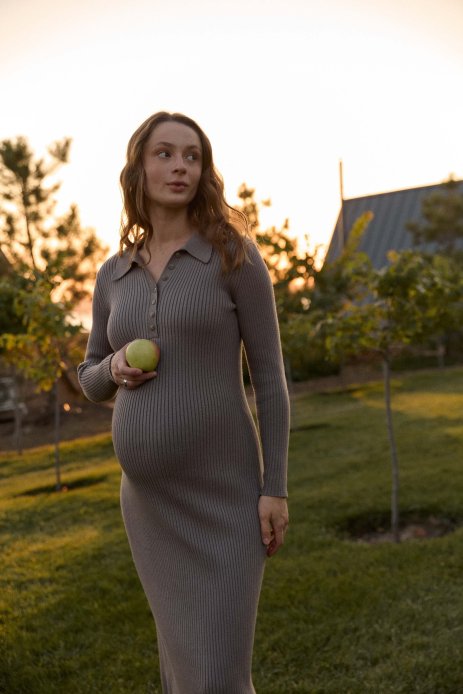 Сукня м’яко облягає тіло, не сковує рухів і не тисне. Приталений силует підкреслює жіночність, а довжина міді додає образу витонченості. Від коліна сукня розширюється, надаючи силуету м’якості та граційності. Комір-«сорочка» та акуратна планка на гудзиках додають образу стриманої елегантності. Ідеально підходить для будь-якого періоду вагітності, а після народження залишається зручною та актуальною.