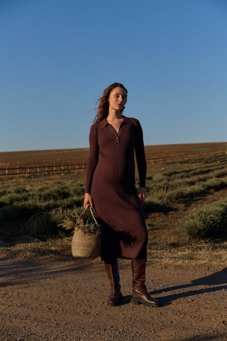 Сукня м’яко облягає тіло, не сковує рухів і не тисне. Приталений силует підкреслює жіночність, а довжина міді додає образу витонченості. Від коліна сукня розширюється, надаючи силуету м’якості та граційності. Комір-«сорочка» та акуратна планка на гудзиках додають образу стриманої елегантності. Ідеально підходить для будь-якого періоду вагітності, а після народження залишається зручною та актуальною.