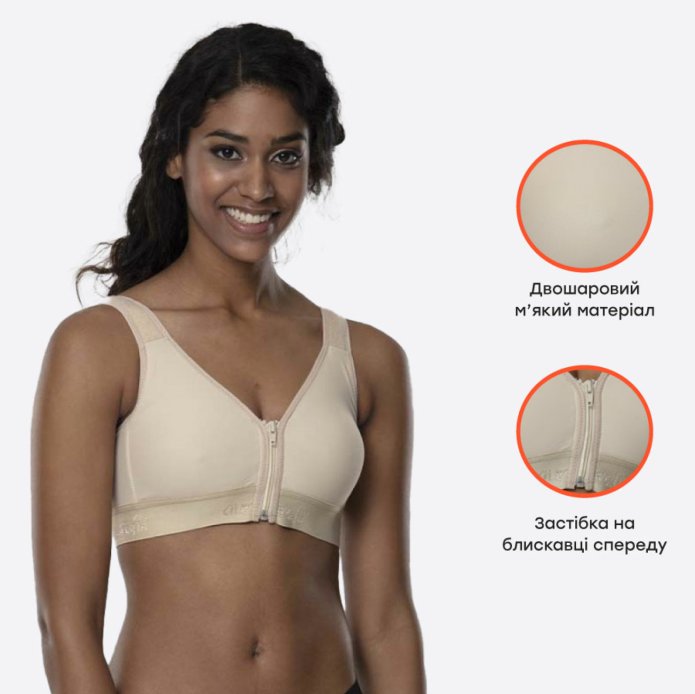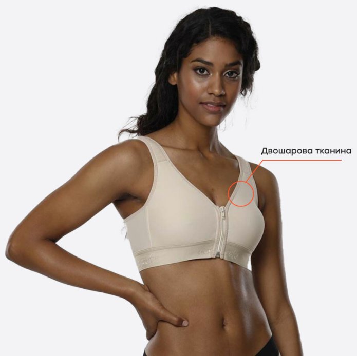 Регульований бюстгальтер з блискавкою спереду і застібкою ззаду з двошарового м'якого гнучкого матеріалу, використовується після операцій по збільшенню і зменшенню грудей.