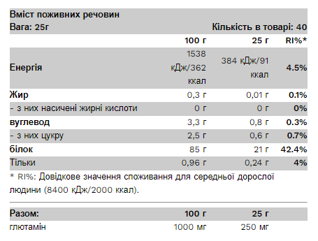 Рекомендуемая дозировка: одну порцию (25 г) смешайте с 250 мл воды или нежирного или растительного молока по вашему вкусу. Принимайте две порции в тренировочные дни. Принимайте одну порцию после тренировки и другую порцию между едой.